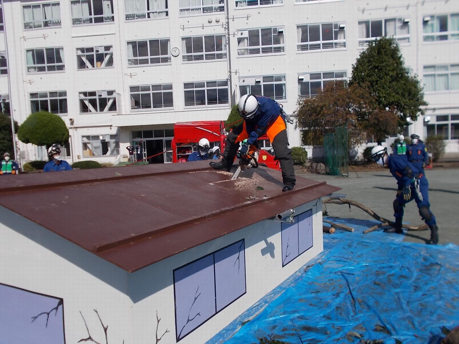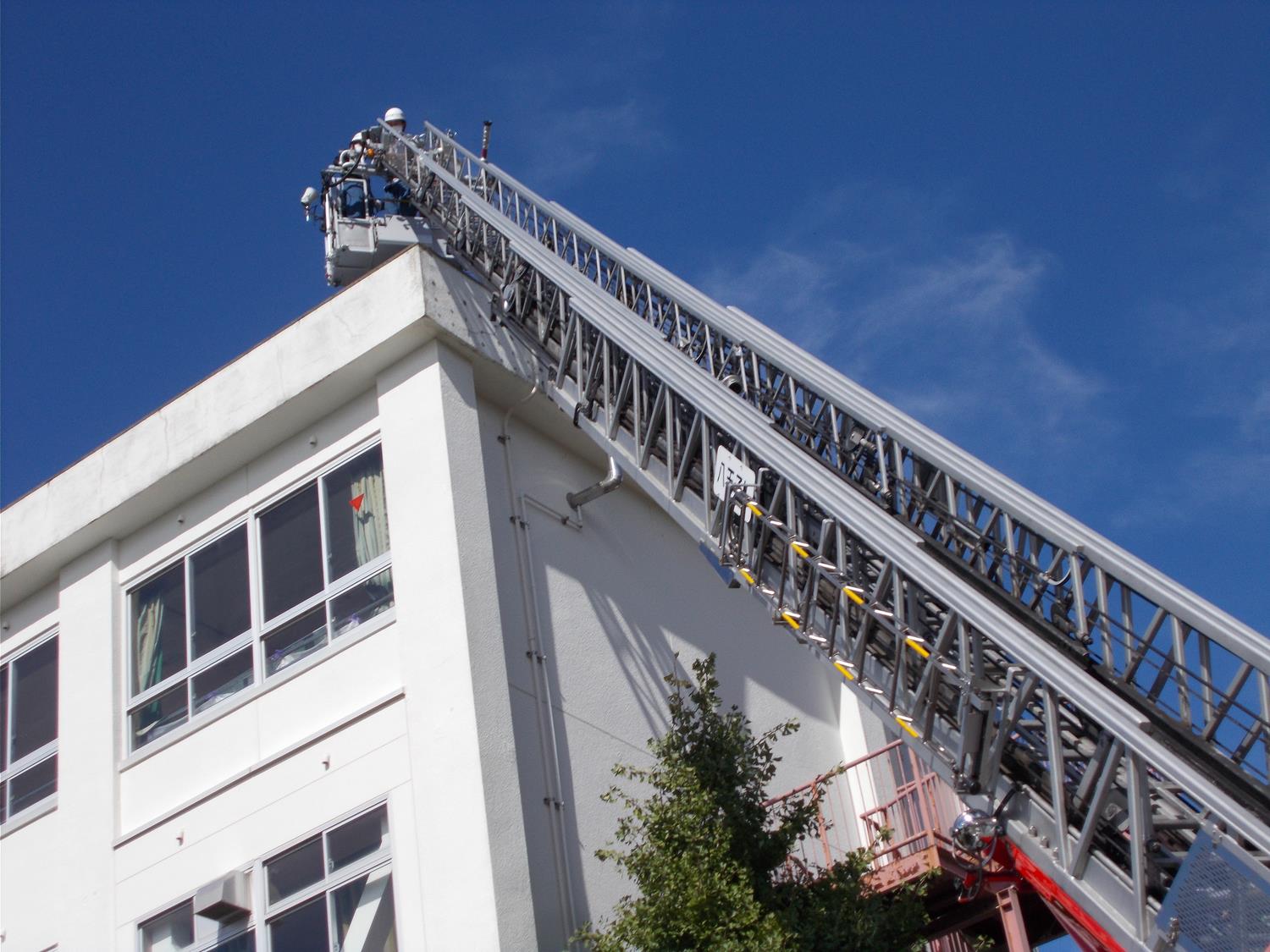 •隊員がはしご車で屋上へ向かいました。