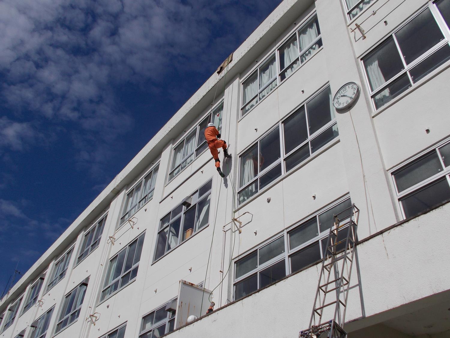 •隊員がロープを使って屋上へ到達しました。