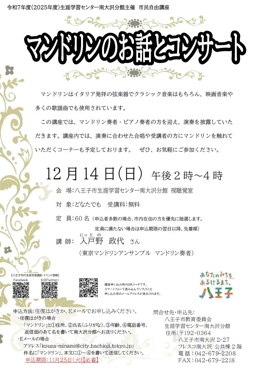 この講座では、マンドリン奏者・ピアノ奏者の方を迎え、演奏を披露していただきます。講座内では、演奏に合わせた合唱や受講者の方にマンドリンを触れていただくコーナーも予定しております。 ぜひ、お気軽にご参加ください。