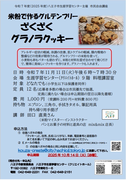 - トップ > イベント情報 > 講座・教室 > 市民自由講座「米粉で作るグルテンフリーざくざくグラノラクッキー」