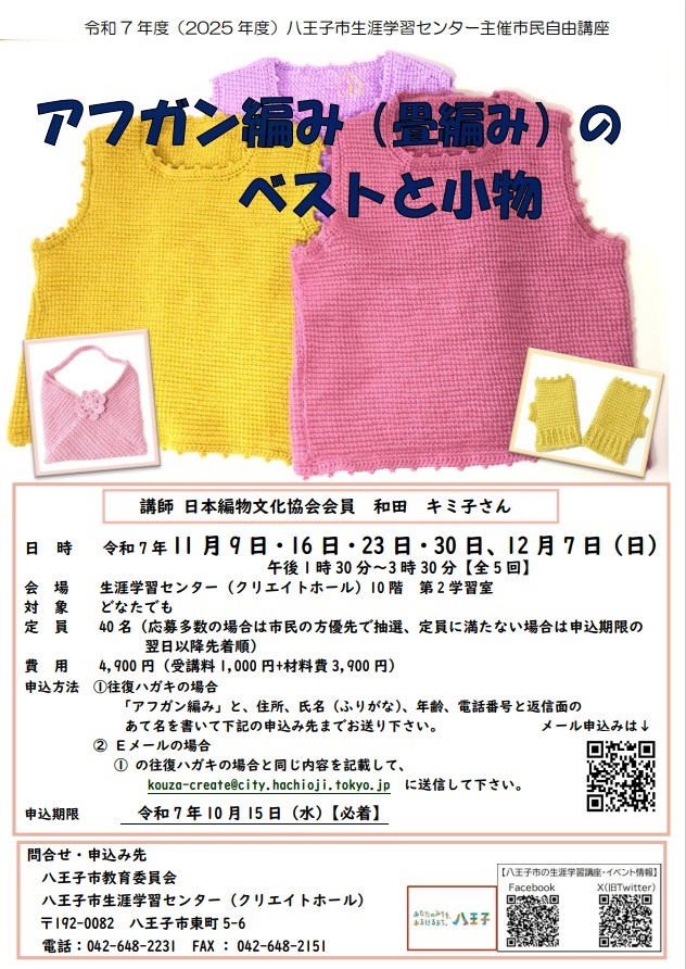 - トップ > イベント情報 > 講座・教室 > 市民自由講座「アフガン編み(畳編み)のベストと小物」