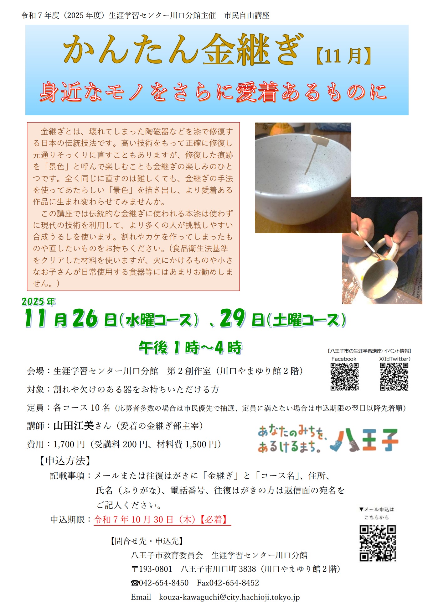 1.記載事項 メールまたは往復はがきに「金継ぎ」と「コース名」、住所、氏名(ふりがな)、 電話番号、往復はがきの方は返信面の宛名をご記入ください。
