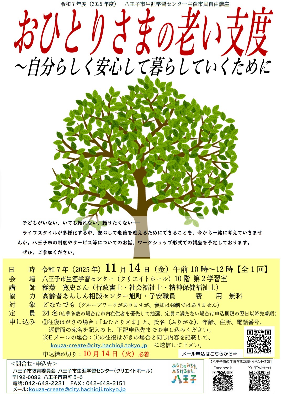 ライフスタイルが多様化する中、安心して老後を迎えるためにできることを、今から一緒に考えていきませんか。八王子市の制度やサービス等についてのお話、ワークショップ形式での講座を予定しております。