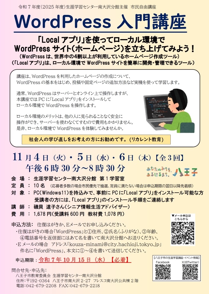 - トップ > イベント情報 > 講座・教室 > 市民自由講座「WordPress入門講座~「Localアプリ」を使ってローカル環境で WordPressサイト(ホームページ)を立ち上げてみよう!~」