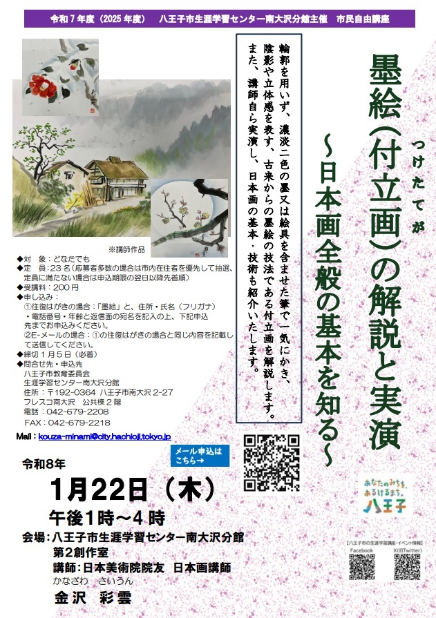 トップ > イベント情報 > 講座・教室 > 市民自由講座「墨絵(付立画)の解説と実演~日本画全般の基本を知る ~」