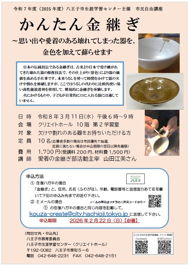 - トップ > イベント情報 > 講座・教室 > 市民自由講座「かんたん金継ぎ~思い出や愛着のある壊れてしまった器を、金色を加えて蘇らせます」