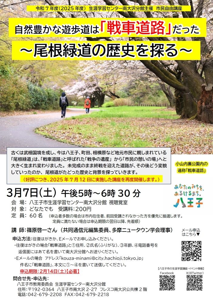 - トップ > イベント情報 > 講座・教室 > 市民自由講座「自然豊かな遊歩道は「戦車道路」だった~尾根緑道の歴史を探る~」