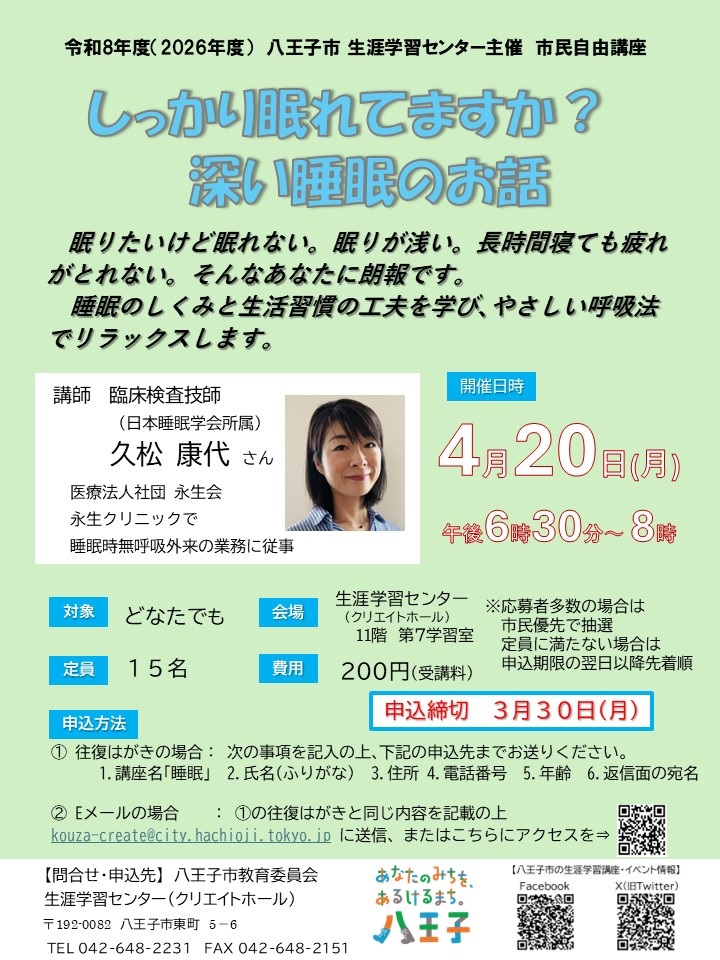 - トップ > イベント情報 > 講座・教室 > 市民自由講座「しっかり眠れてますか? 深い睡眠のお話」