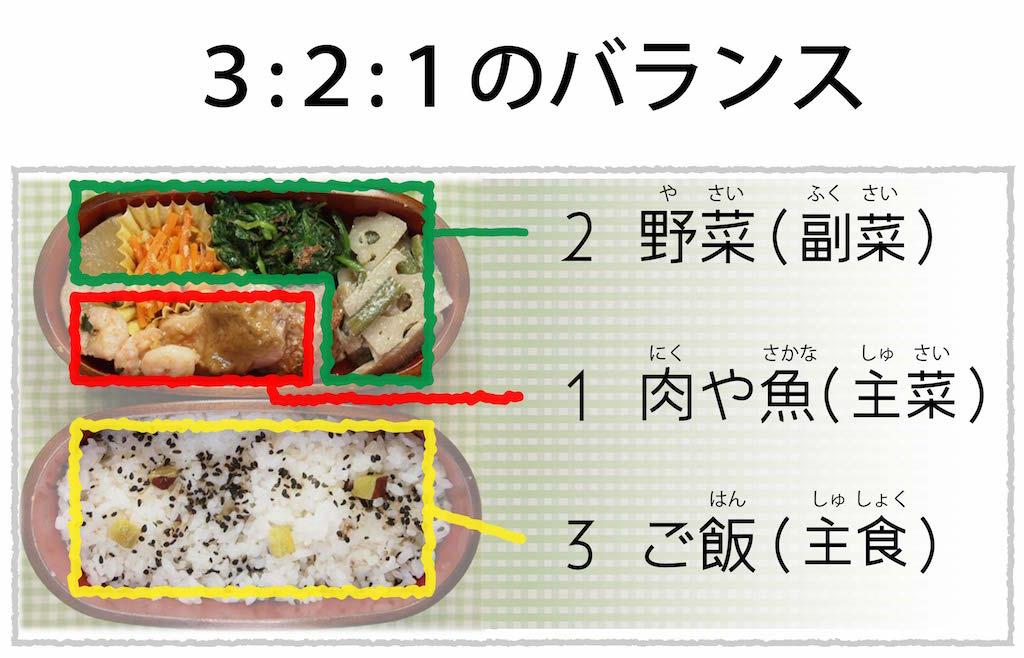 中学卒業までに、「ごはん:野菜のおかず:肉や魚のおかず=3:2:1のバランス弁当」を自分で作ることができるようになるために、まずは、弁当箱にバランスよく詰めることから始めてみましょう!