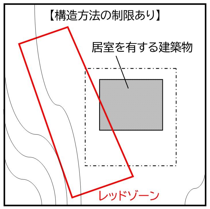 居室を有する建築物の一部が土砂災害特別警戒区域(レッドゾーン)に含まれている場合は、令第80条の3の構造方法の制限の対象となります。