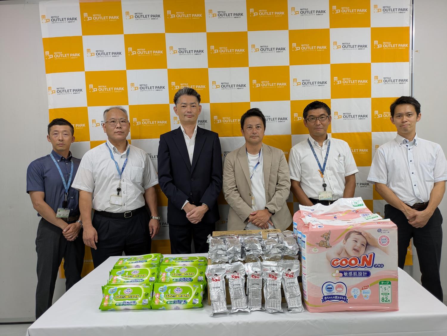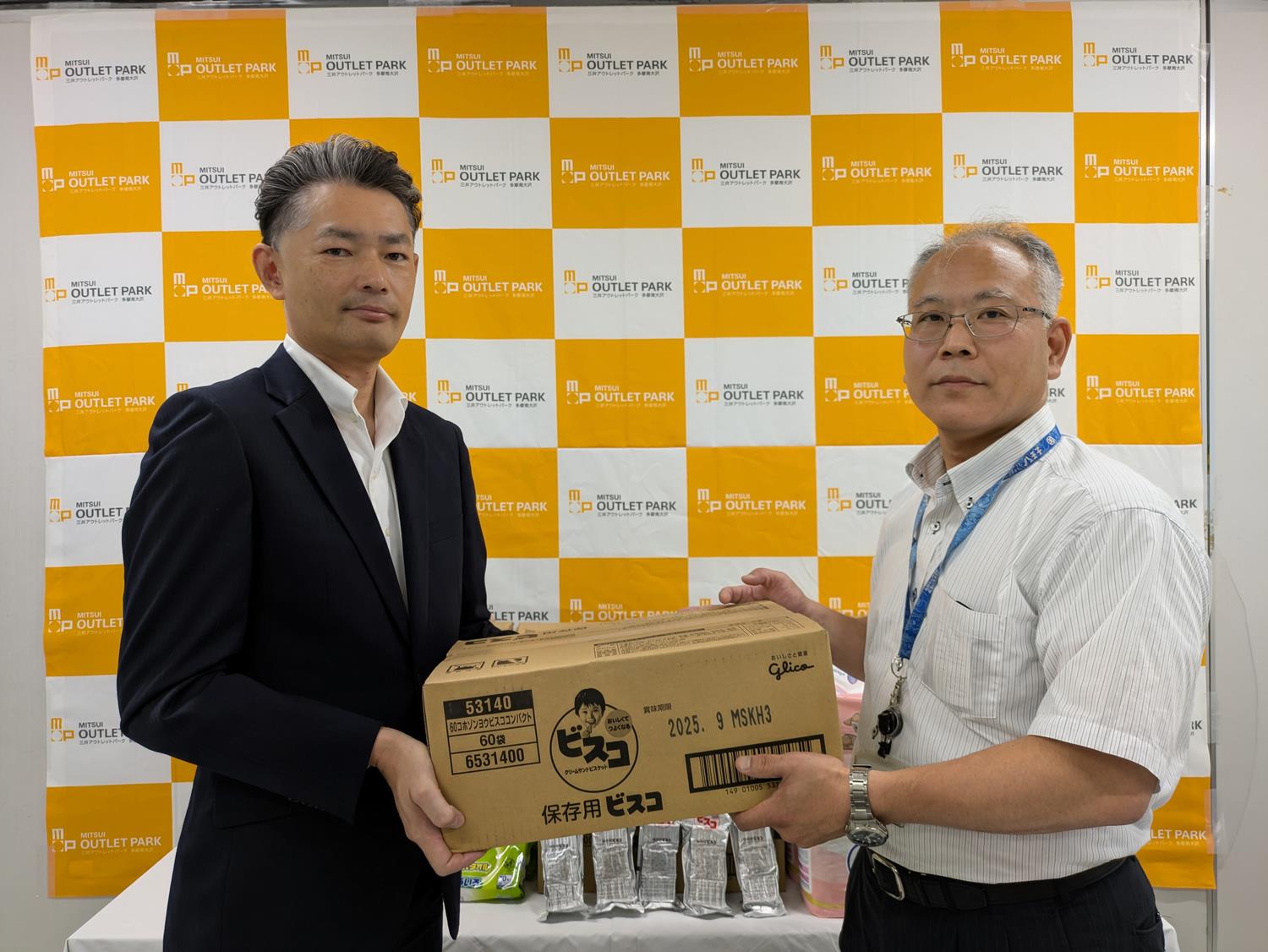 令和7年8月7日に三井アウトレットパーク 多摩南大沢様より、SDGsの取組の一環として防災備蓄品(保存食および衛生用品)のご寄附をいただきました。