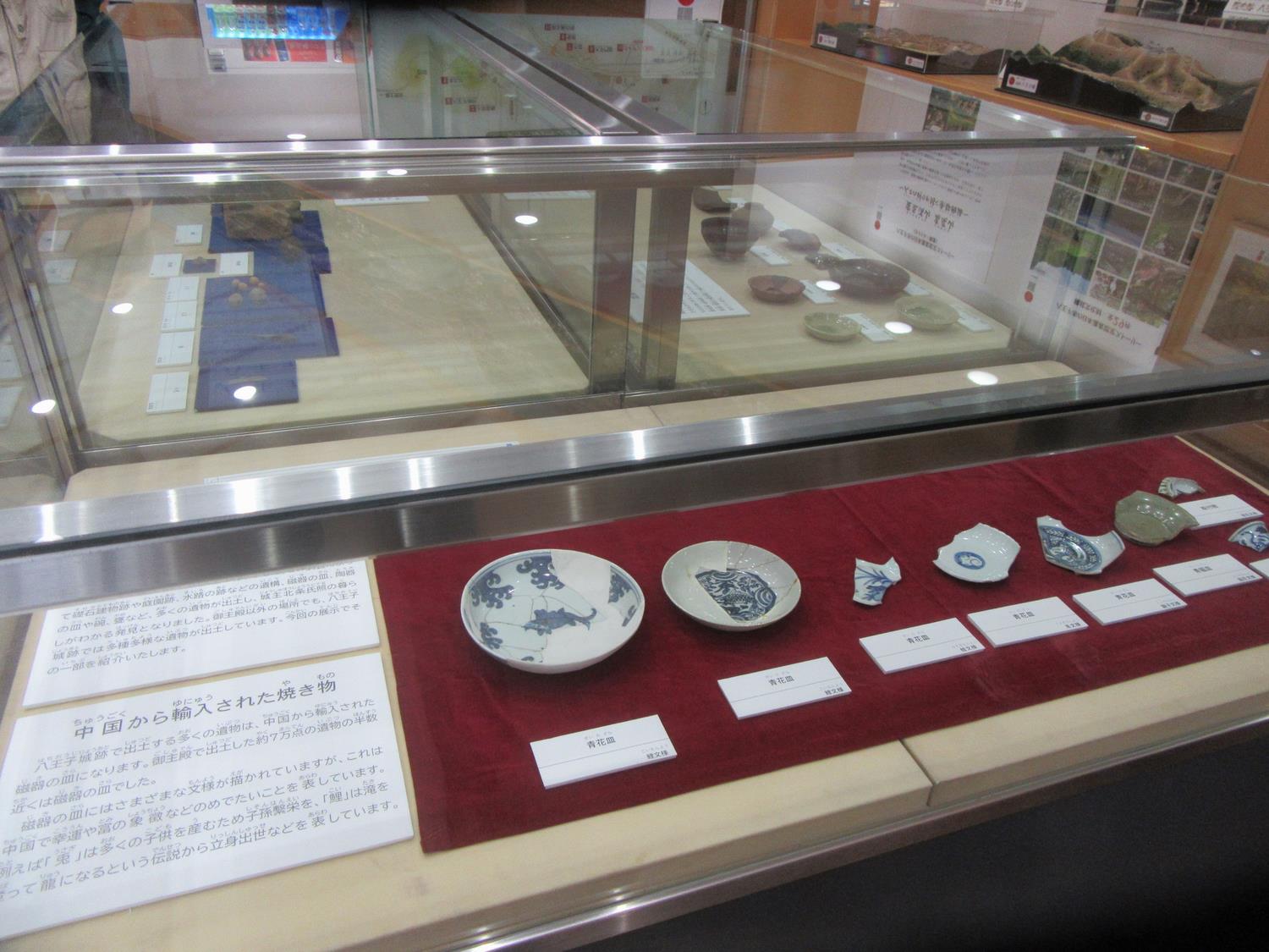 八王子城跡ガイダンス施設では、中国から輸入された皿、碗、国内で焼かれた天目碗(てんもくわん)、甕(かめ)、戦いに必要な鉄砲弾、また、弾を作った道具など、八王子城跡で出土した遺物を展示しています。これらの遺物を通して、八王子城の暮らしや戦いの様子を知ることができます。八王子城跡と併せて、ぜひご覧ください。 八王子城跡ガイダンス施設のアクセスや開館時間等は本ページ下部のリンクからご確認ください。