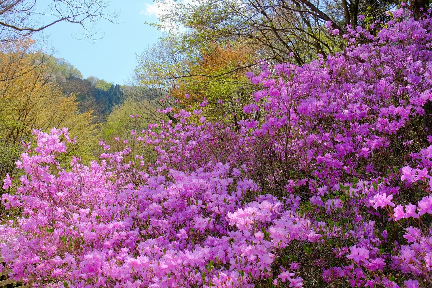 約3,000本のミツバツツジが園内を彩る春(写真左)