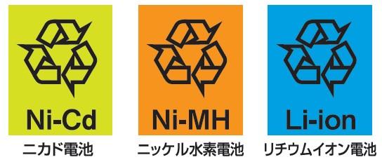 以下のマークが付いている小型充電式電池をリサイクルボックスに入れることができます。