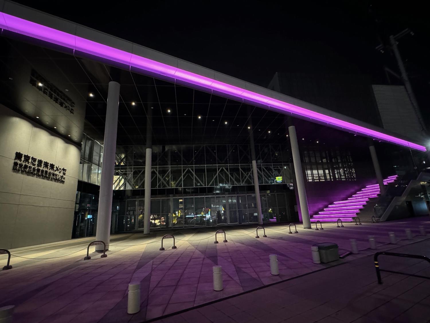 東京たま未来メッセ外階段をピンク色にライトアップ