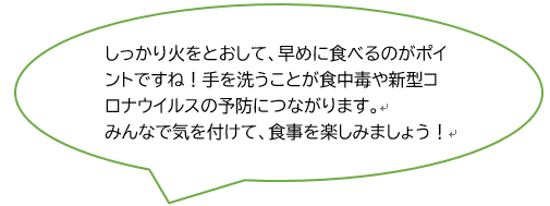 ・家庭で調理したものもできるだけ時間を置かずに食べきりましょう