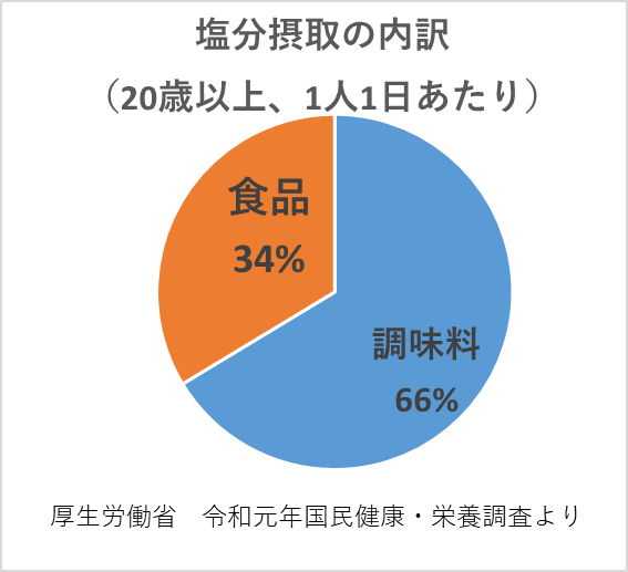 1日のうち、7割弱は調味料から、3割強は食品から塩分を摂取しています。