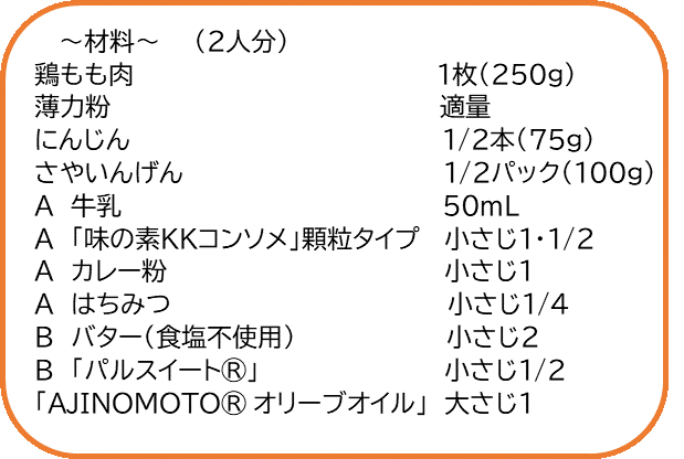 (1)鶏肉は開いて厚さを均一にし、薄力粉をまぶす。にんじんは1cm幅の輪切りにし、さやいんげんは2等分に切る。