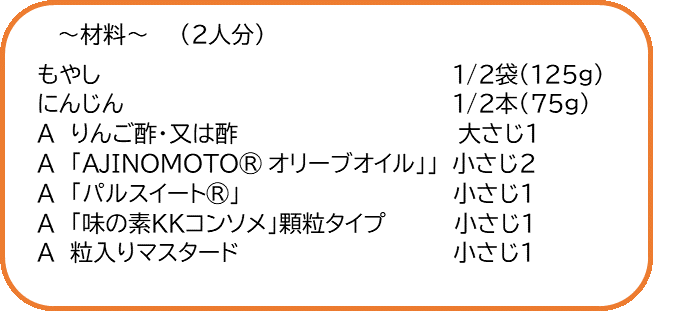 (4)耐熱容器に(1)のにんじん・さやいんげんを入れ、ラップをかけて、電子レンジ(600W)で3分加熱する。Bを加え全体を混ぜる。