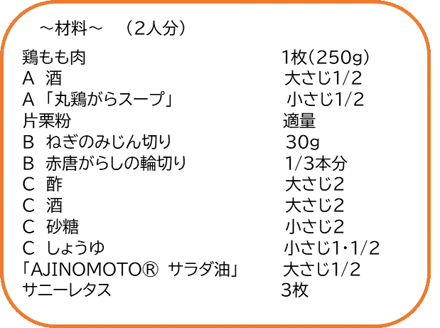 (1)鶏肉は皮目にフォークで数か所穴をあけ、1cm間隔に浅く切り込みを入れる。Aをまぶして10分ほどおき(時間外)、片栗粉をまぶす。