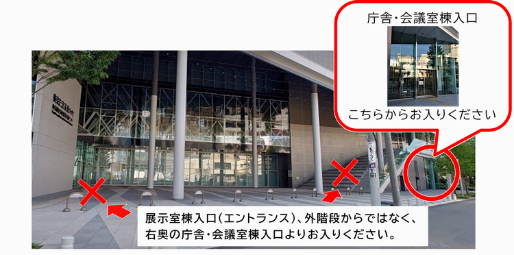 保健所会議室へは、展示棟入口、外階段からではなく、庁舎・会議室棟入口よりお入りいただき、階段・エレベーターで4階または5階へお越しください。