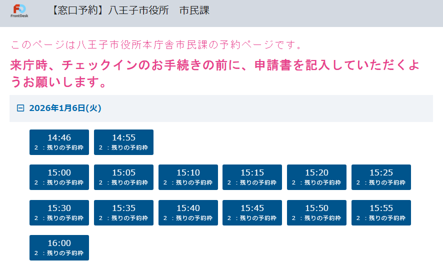 なお、予約サイトからの予約を行っているのは本庁市民課と八王子駅南口総合事務所のみです。