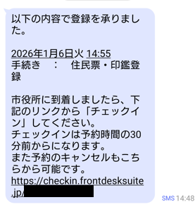 当日のチェックイン手続きをするためのURLもSMSに記載されています。