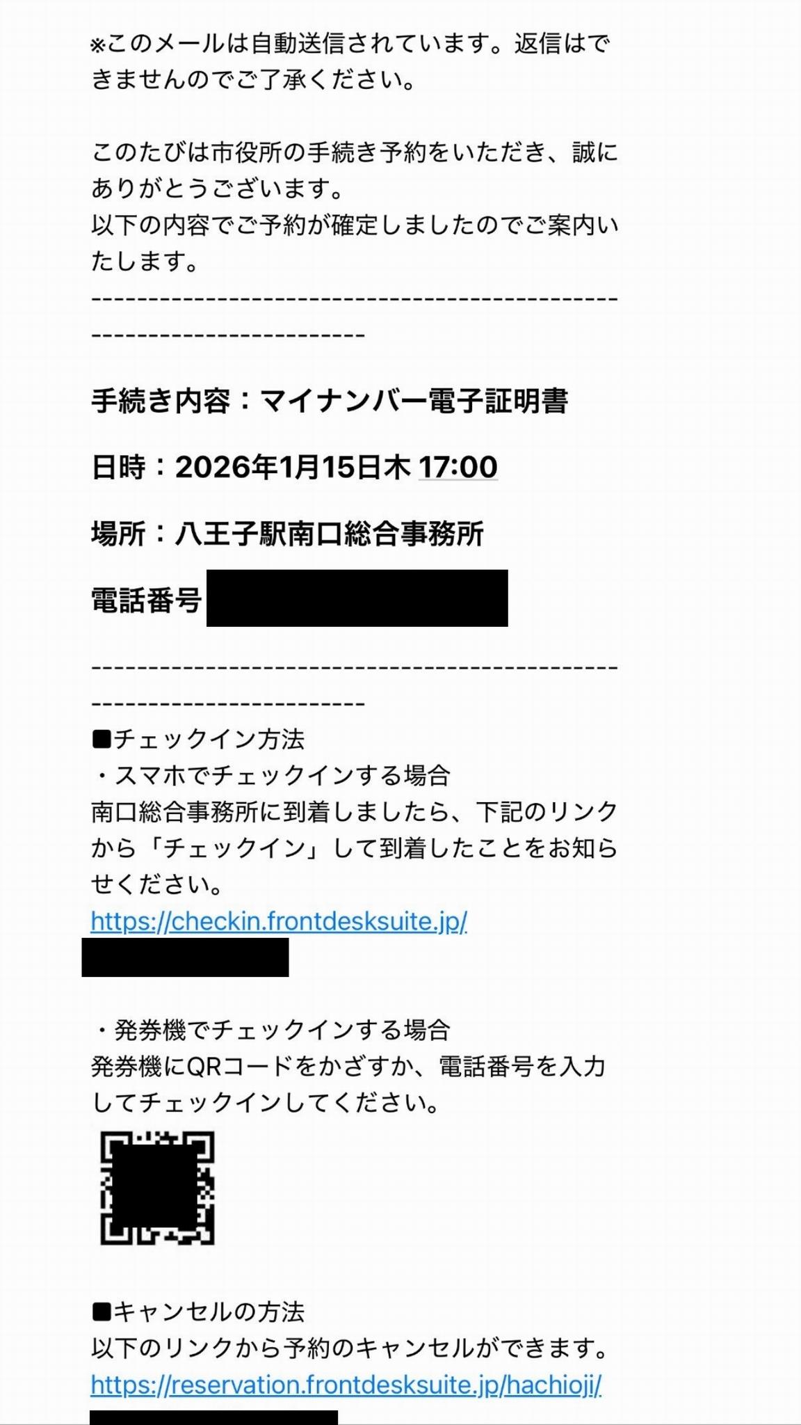 なお、八王子駅南口総合事務所を予約された方は、お知らせのメールも送信されます。
