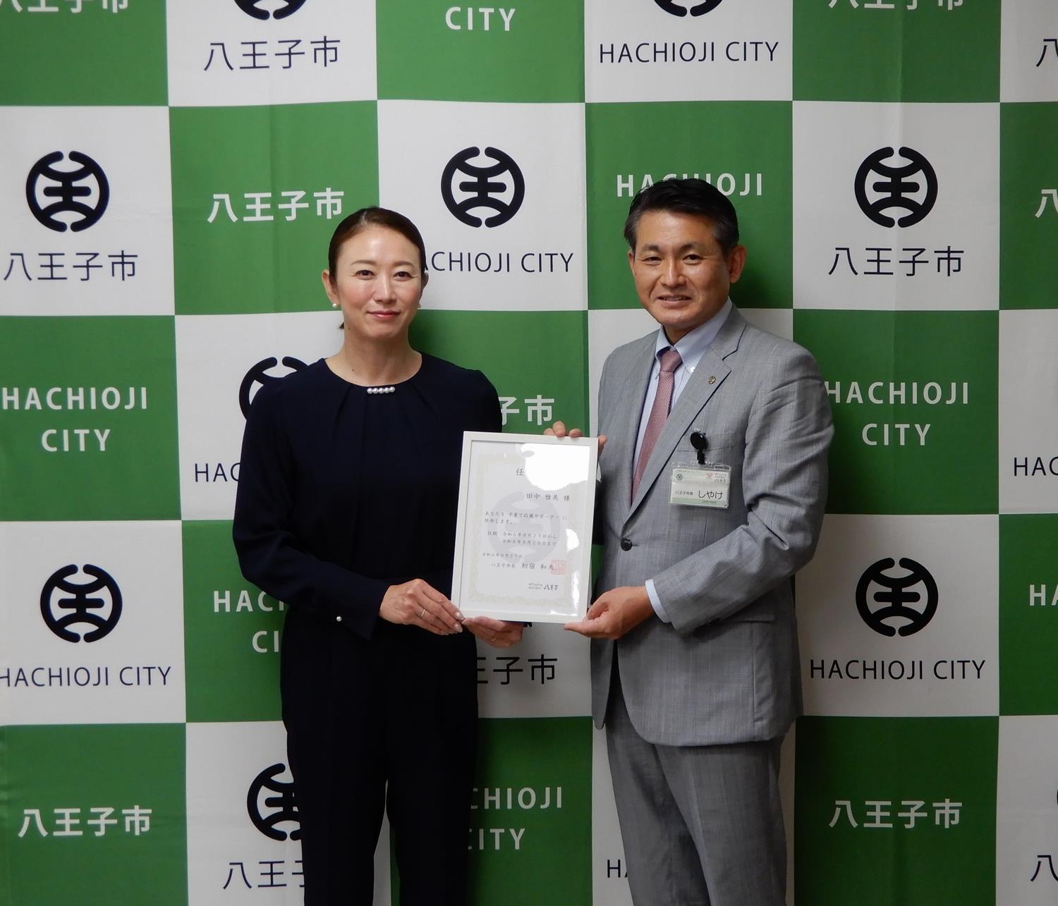 このサポーターに、アトランタオリンピックをはじめ、競泳選手として3度のオリンピックに出場し、現在も二人の子どもを育てる田中雅美さん(八王子学園高等学校・中央大学卒)を任命するため、令和6年(2024年)8月27日に任命式を開催しました。