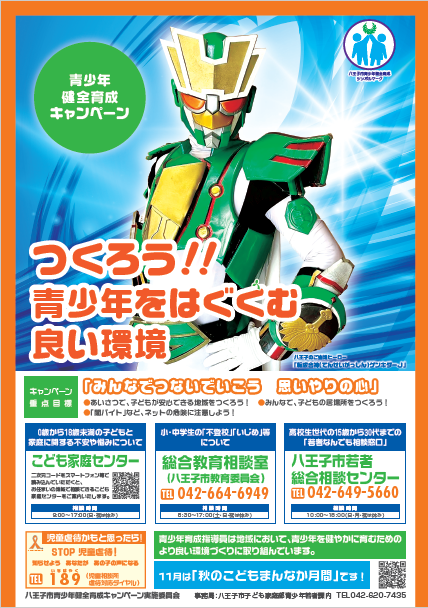 毎年11月は、こども家庭庁が主唱する「秋のこどもまんなか月間」です。本市でも月間にあわせ「八王子市青少年健全育成キャンペーン」を関係各機関や団体の協力のもとに実施しています。青少年が健全に成長できる環境づくりを目的に、啓発物資の配布や各種実態調査などを行います。