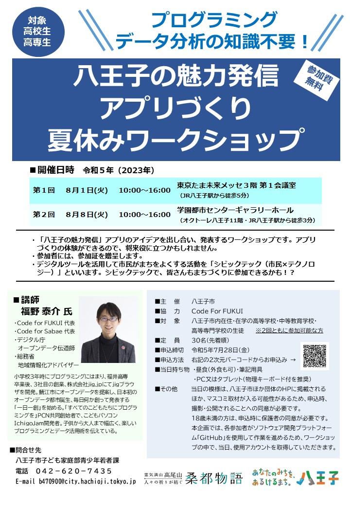 ・八王子市のデータを教材として、データの見方や分析、グラフ化、アプリづくりについて基礎的な学びをワークショップで得ることができます。