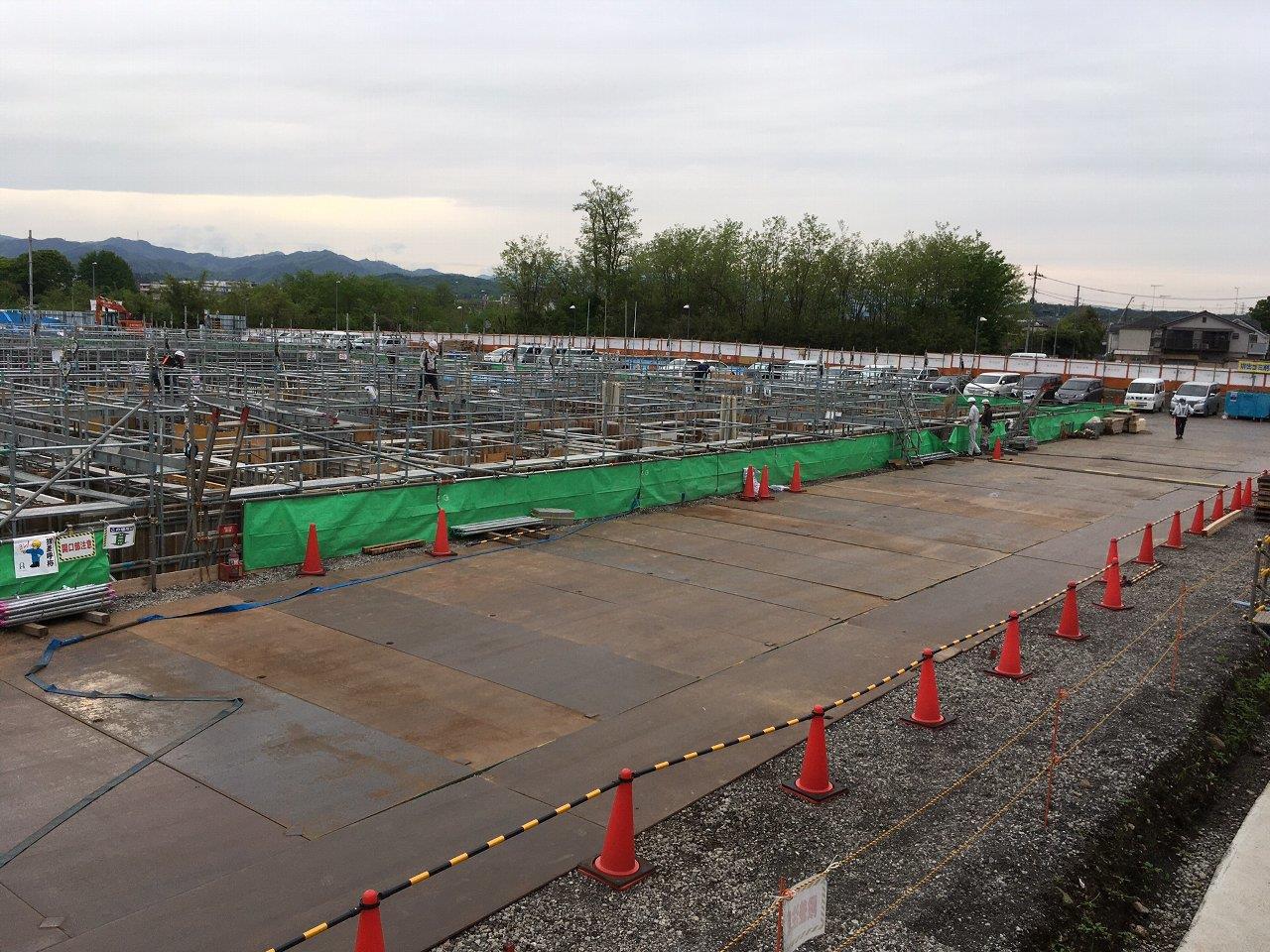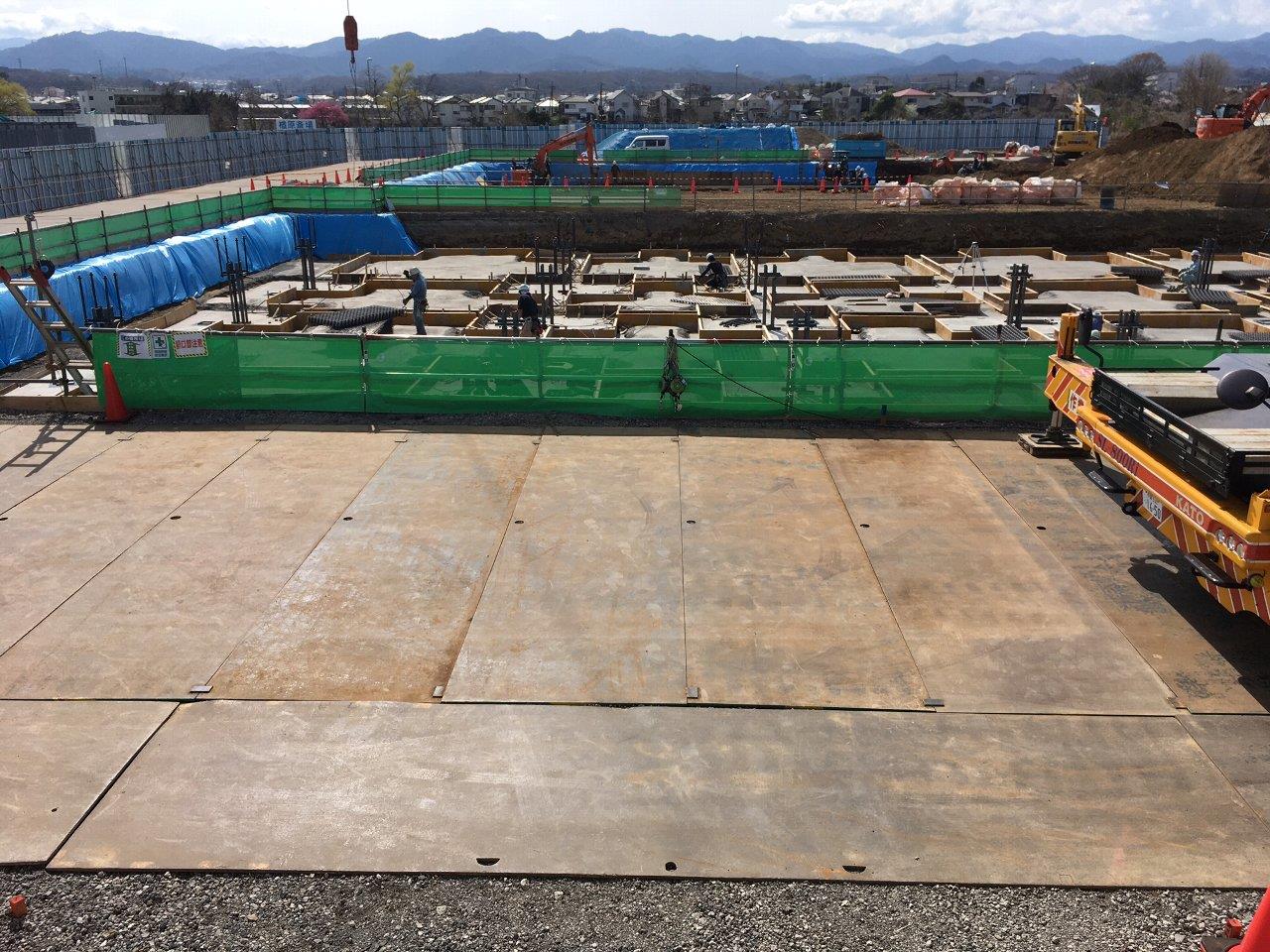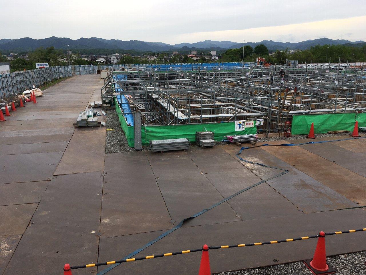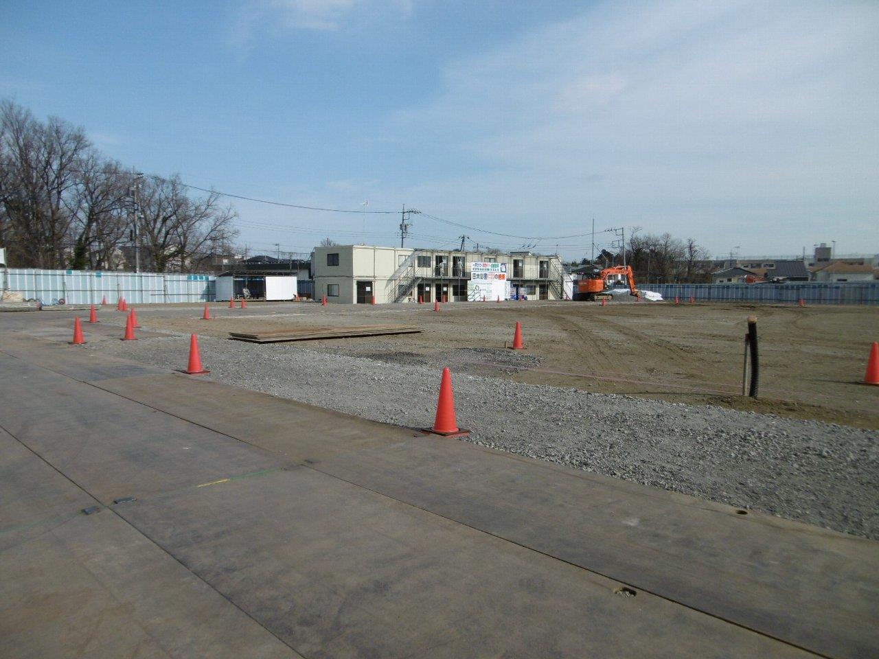 仮設事務所を設置し、鉄板を敷く準備工事を行っています。