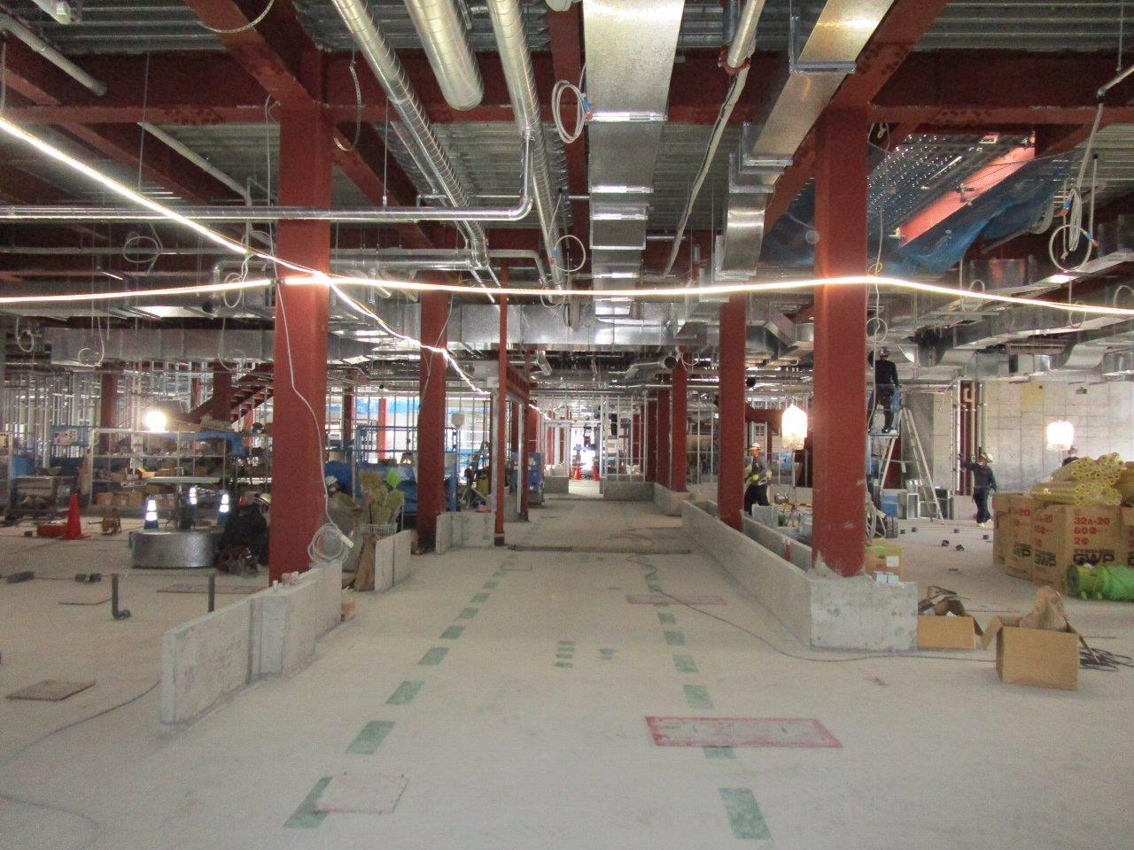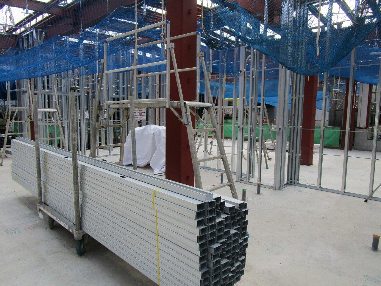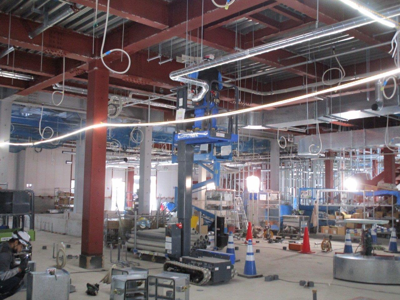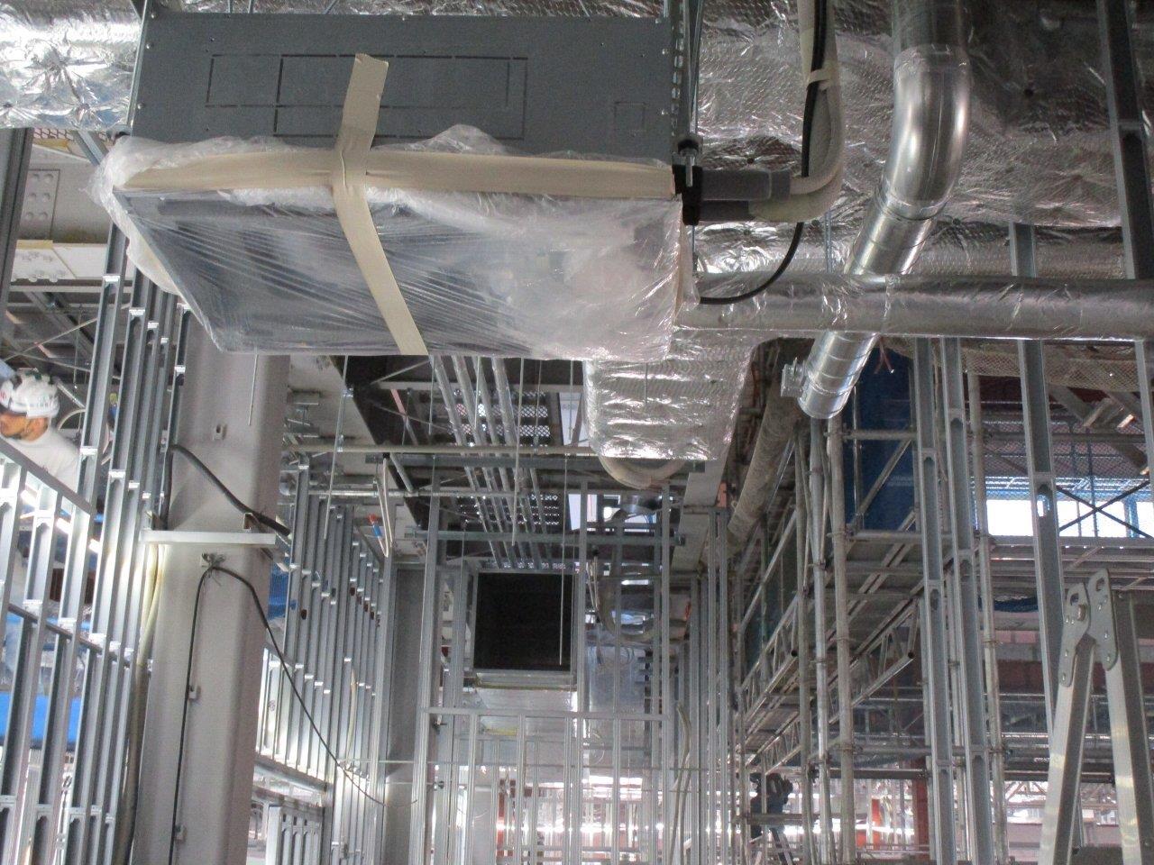 ダクトの吊り込みや、軽量鉄骨で壁や天井の下地を組み立てる作業を行っています。