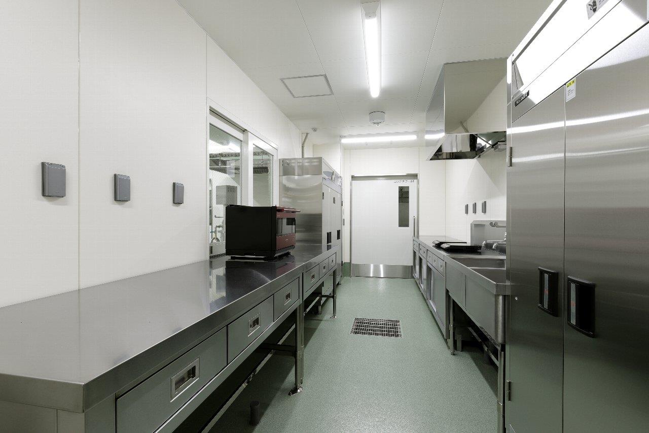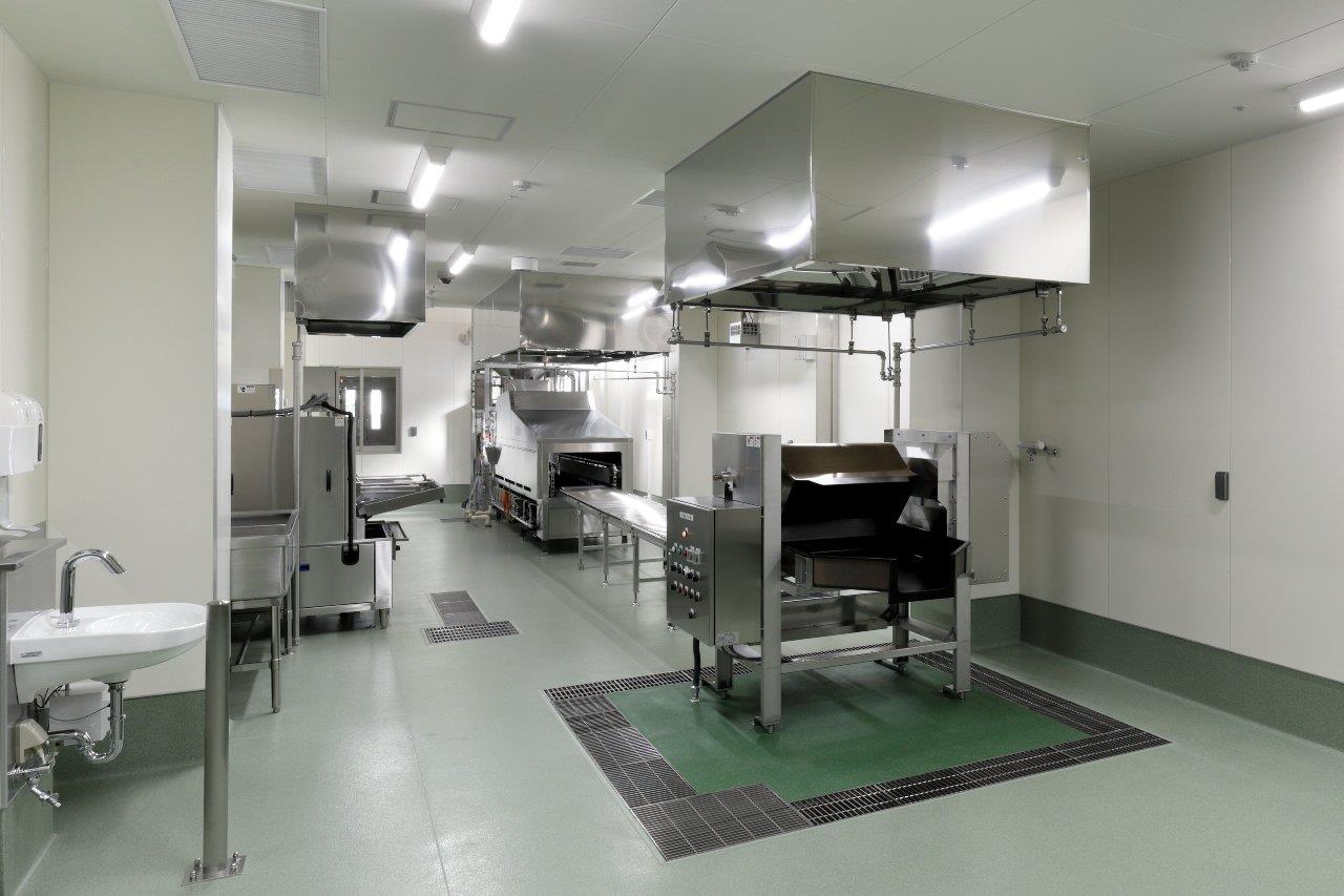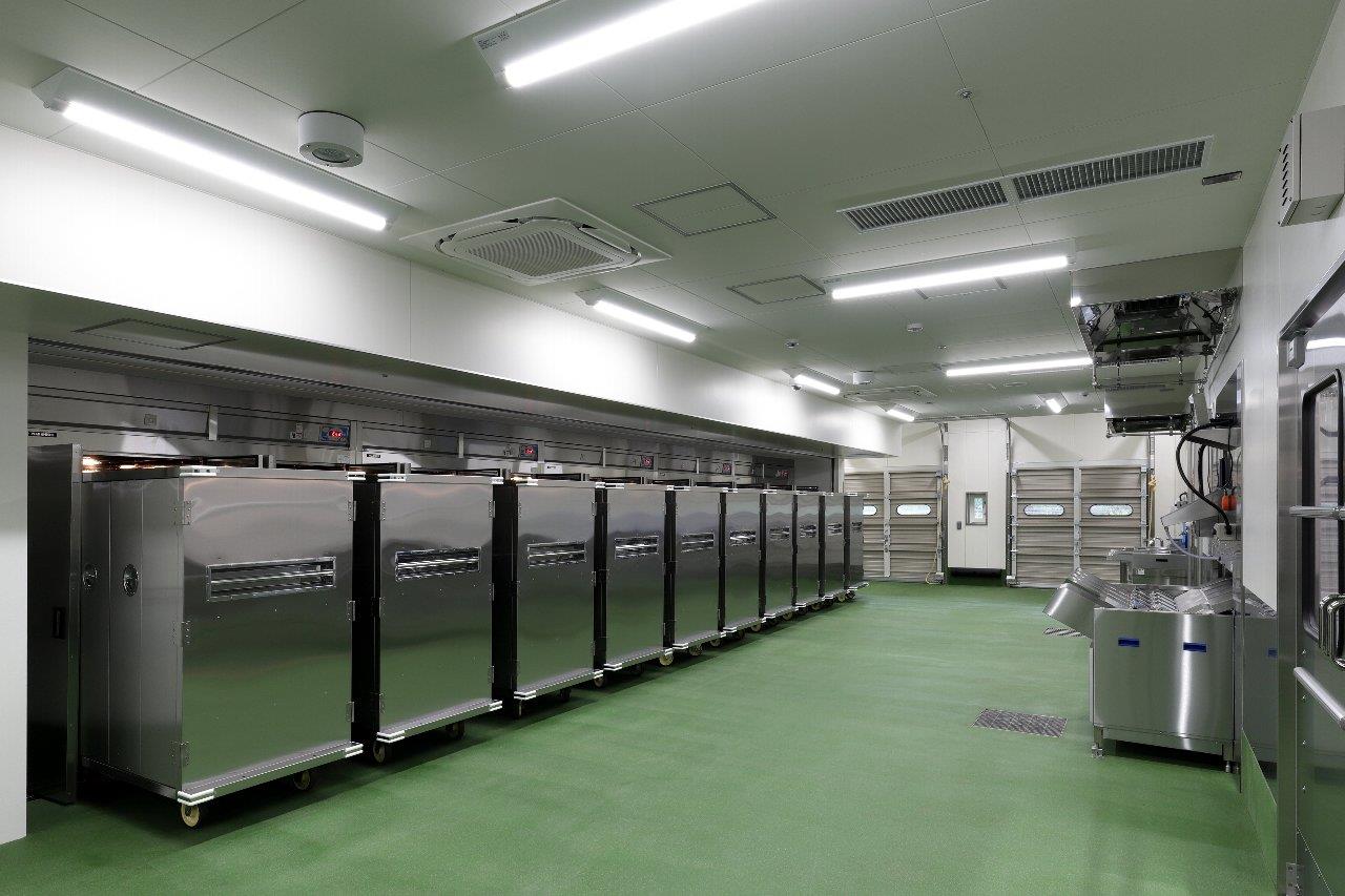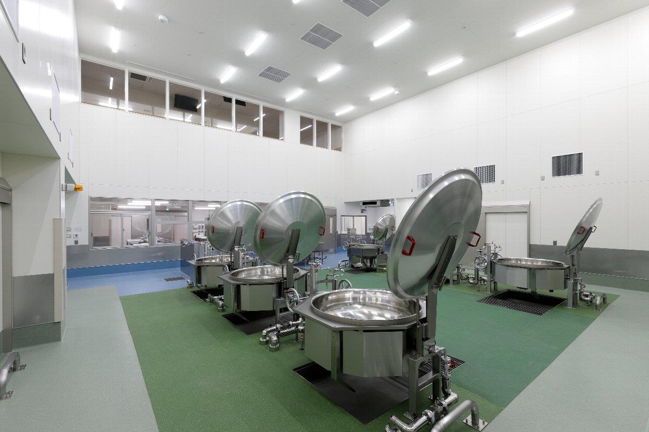 第一調理場 野菜下処理室(見学窓より) 第一調理場 煮炊き調理室(見学窓より)