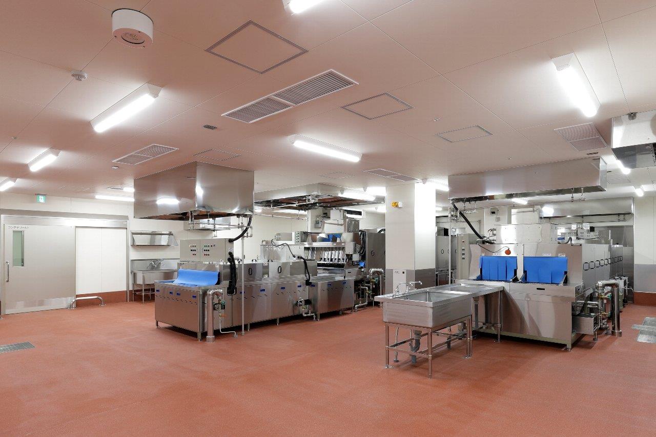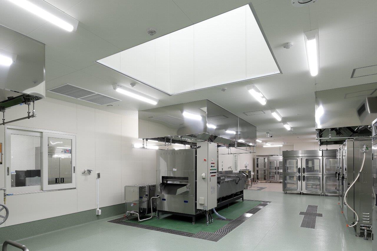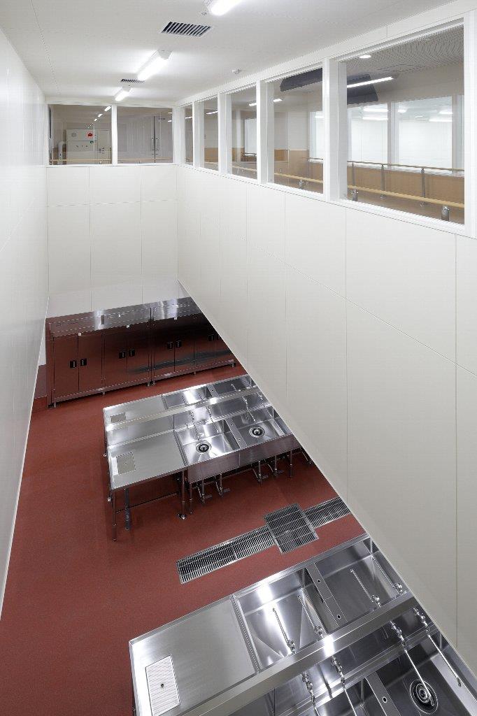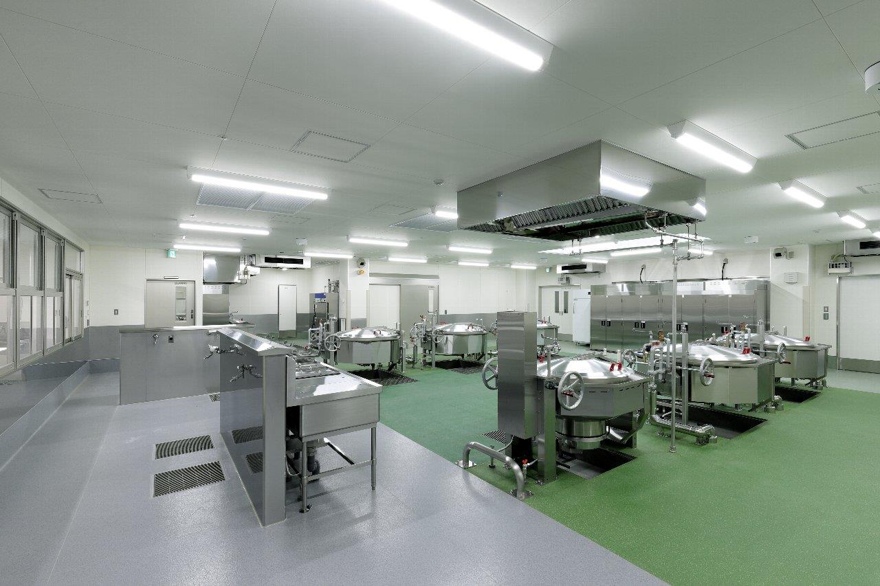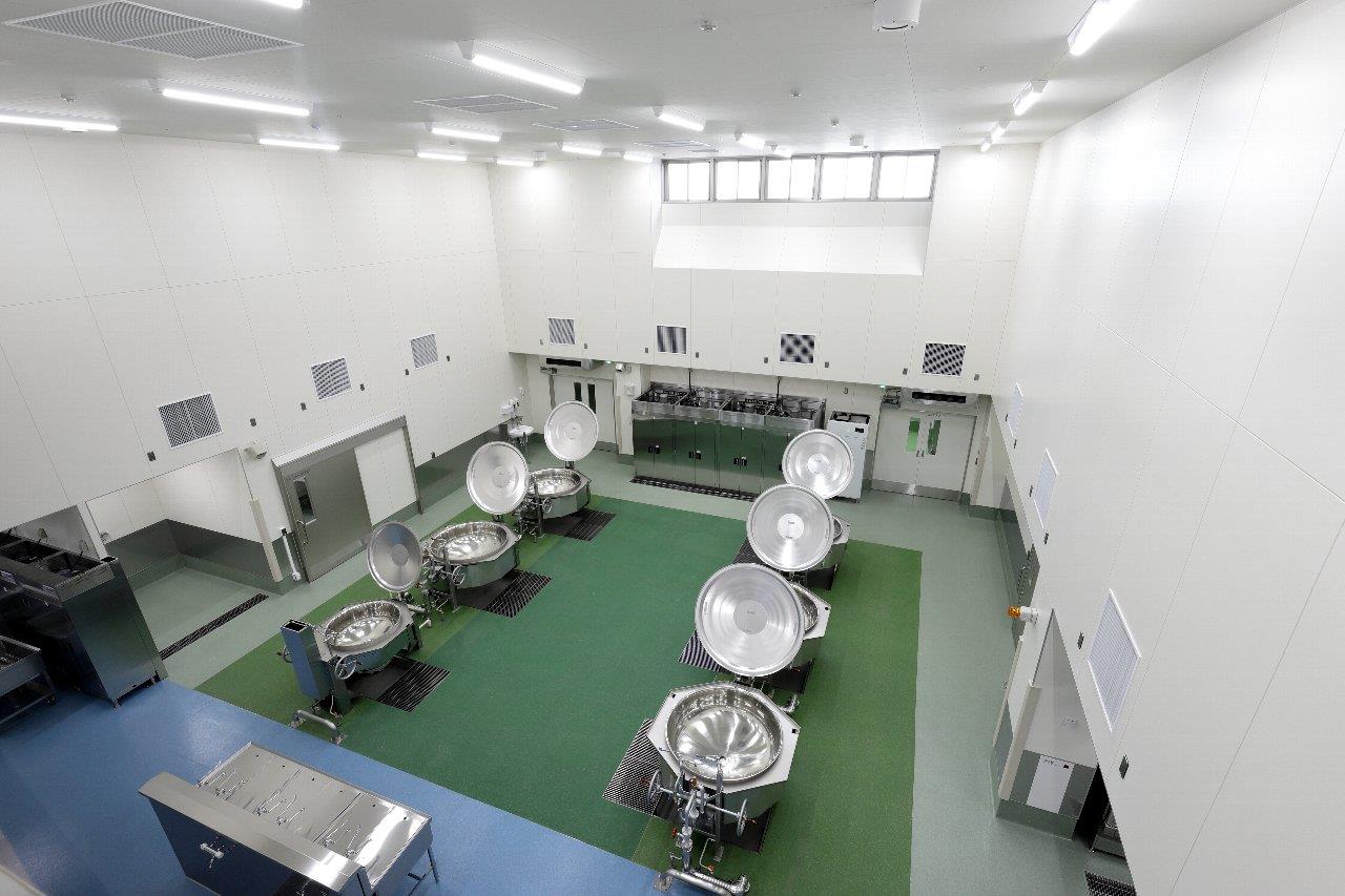 第一調理場 野菜下処理室(見学窓より) 第一調理場 煮炊き調理室(見学窓より)