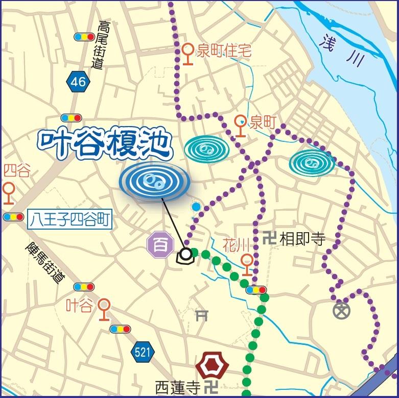 叶谷町は浅川と城山川に接し、その他の河川が周辺部を流れる地形にあり、昔は水が豊富で湧水にも恵まれた土地でした。