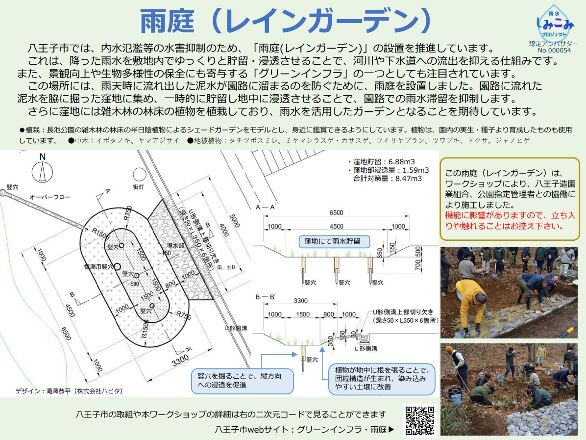 (幅4.5m、深さ50センチメートル)を採用しました。さらに底面にたて穴を掘ること、長池公園に自生している植物を植えることで将来的な土壌改良(浸透機能の向上等)を期待し、雨庭の多面的な機能もデザインされています。