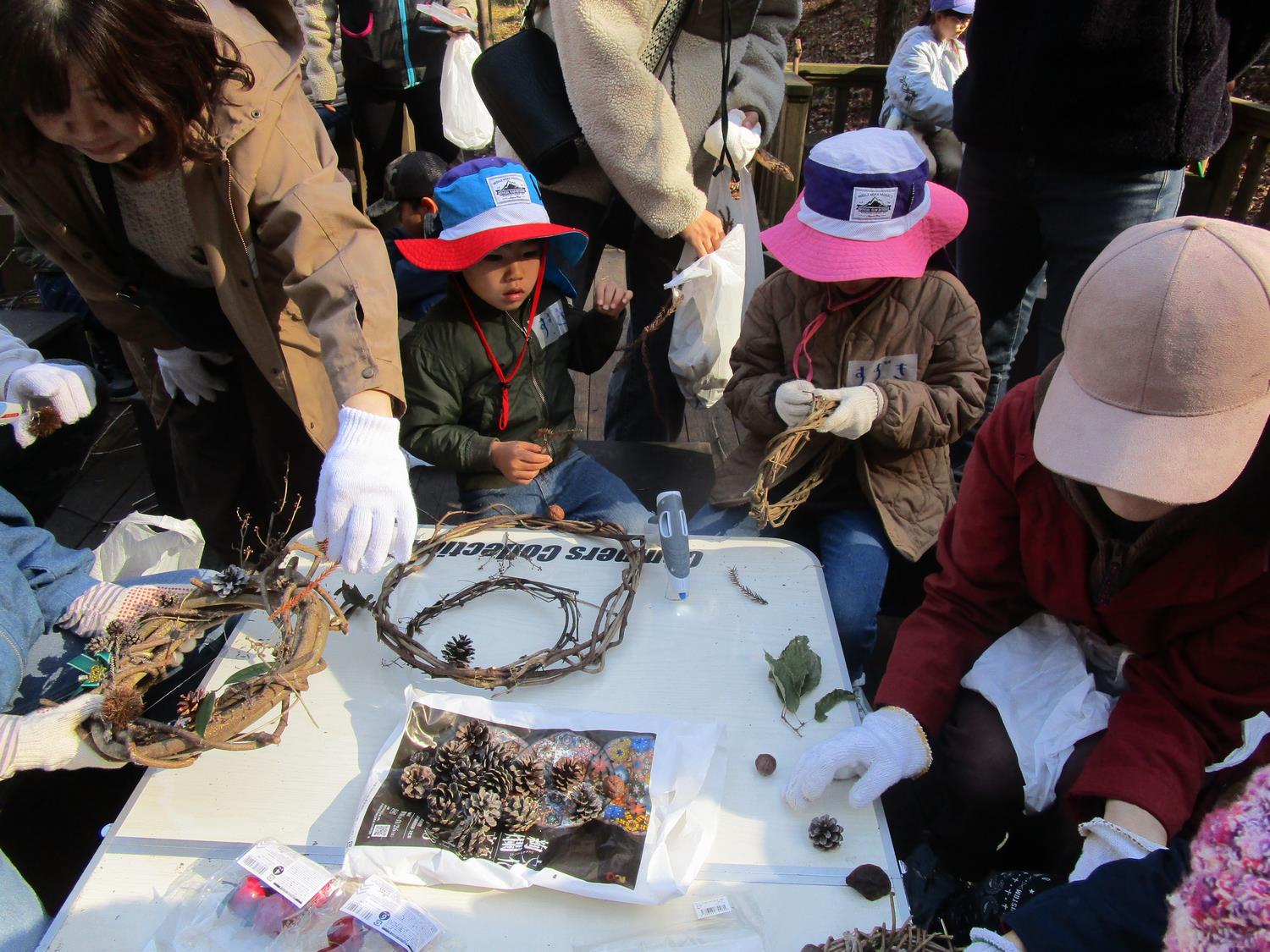 集めた素材を使ってのリースづくり、たき火体験など自然を満喫しました。