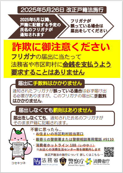 戸籍のフリガナの届出に関連する詐欺にご注意