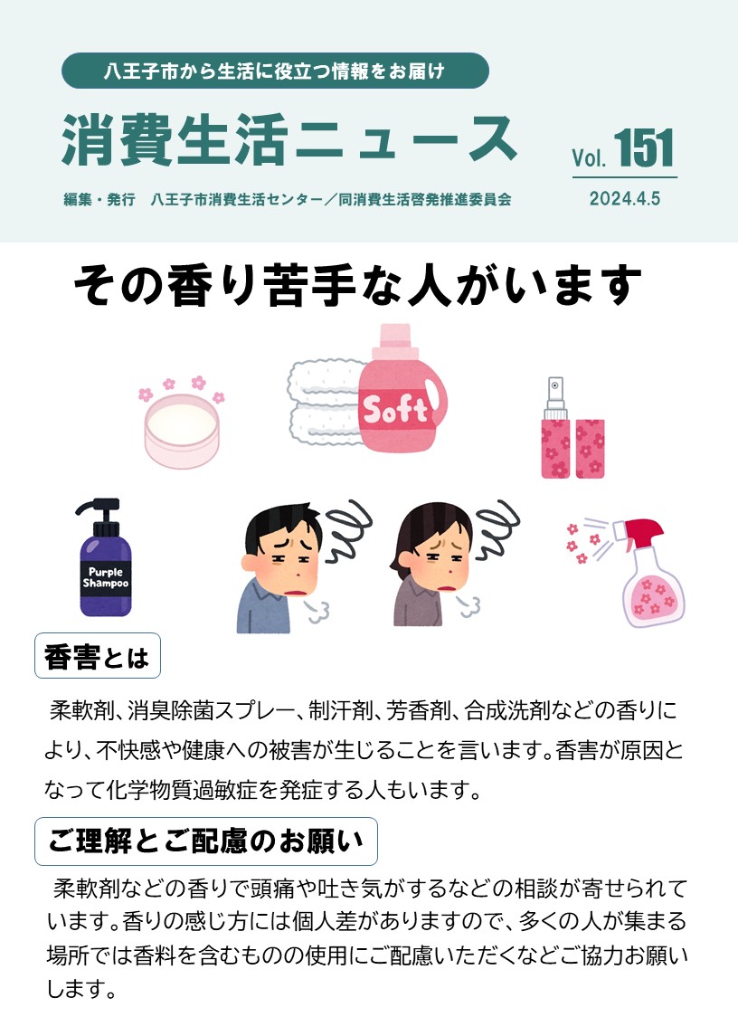 また、香り付き柔軟剤(柔軟仕上げ剤)などの香りのある製品によっては、頭痛や吐き気などの体調不良を起こす方もいて、「香り」に関する相談があります。