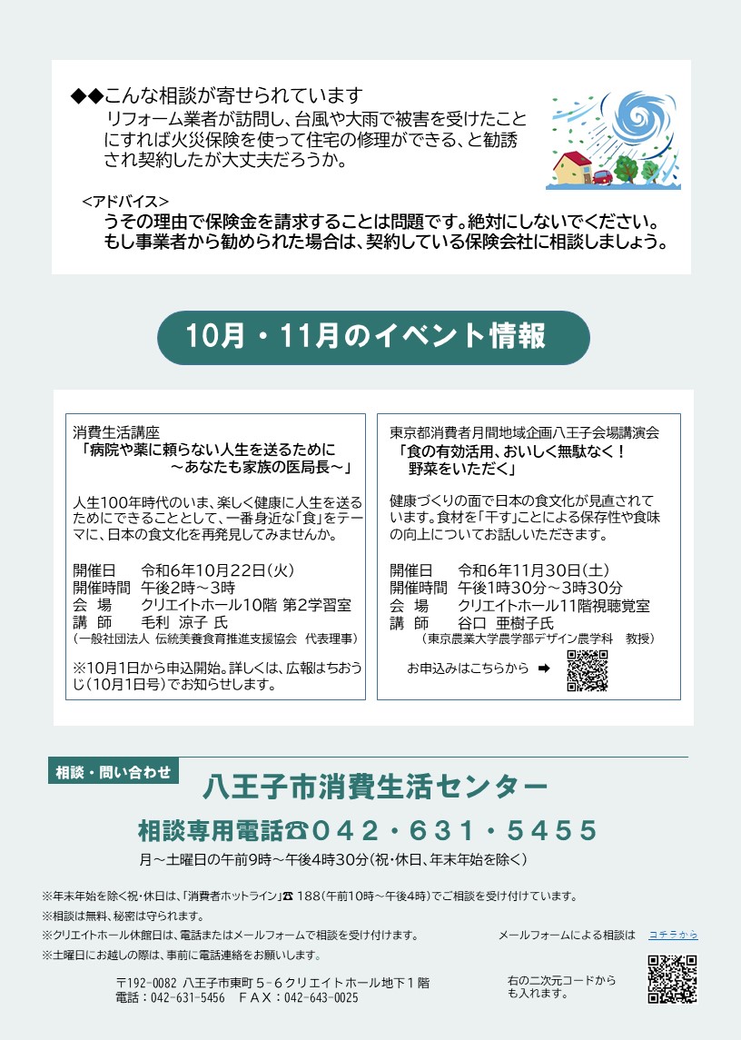 5年9月号 注意!台風・豪雨・大雪・地震などの自然災害の後に「保険を使って無料で住宅を修理します」などの勧誘トラブルが多くなます