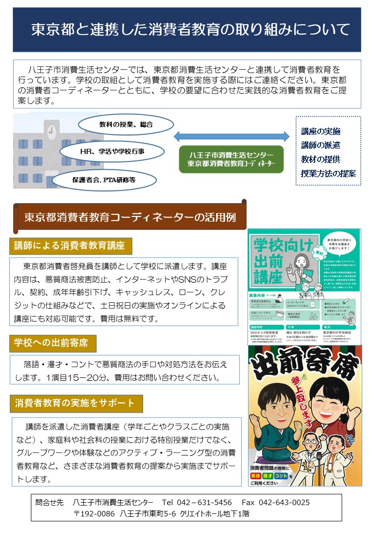 東京都と連携して若年層への消費者教育に力を入れています。東京都が派遣する専門の消費者教育コーディネーターが学校に出向き、生徒・学生参加型のアクティブラーニングやCMコンテストを通じた普及啓発など、工夫をこらした消費者教育を行っています。
