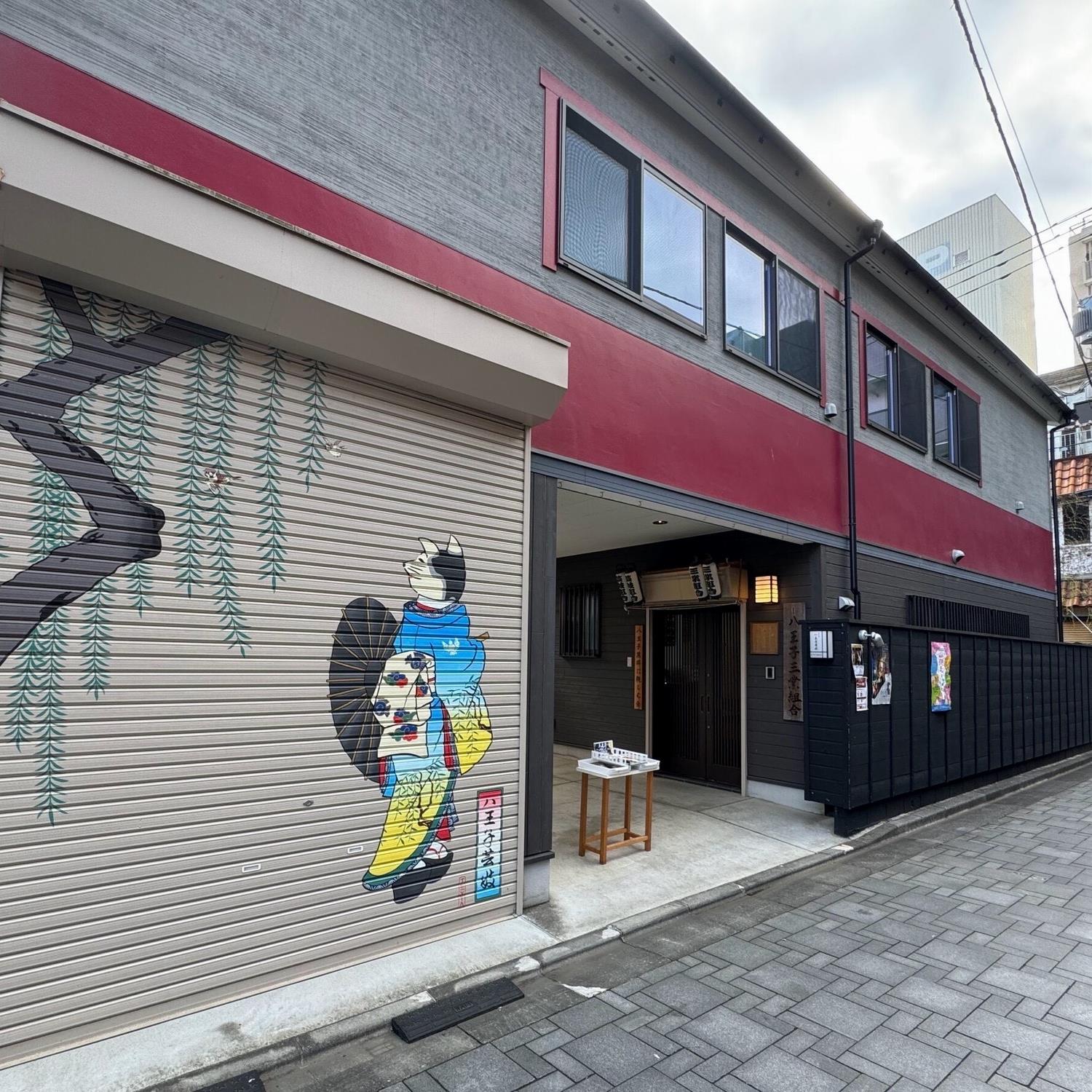 印象深いシャッターの建物は「八王子三業組合」。
