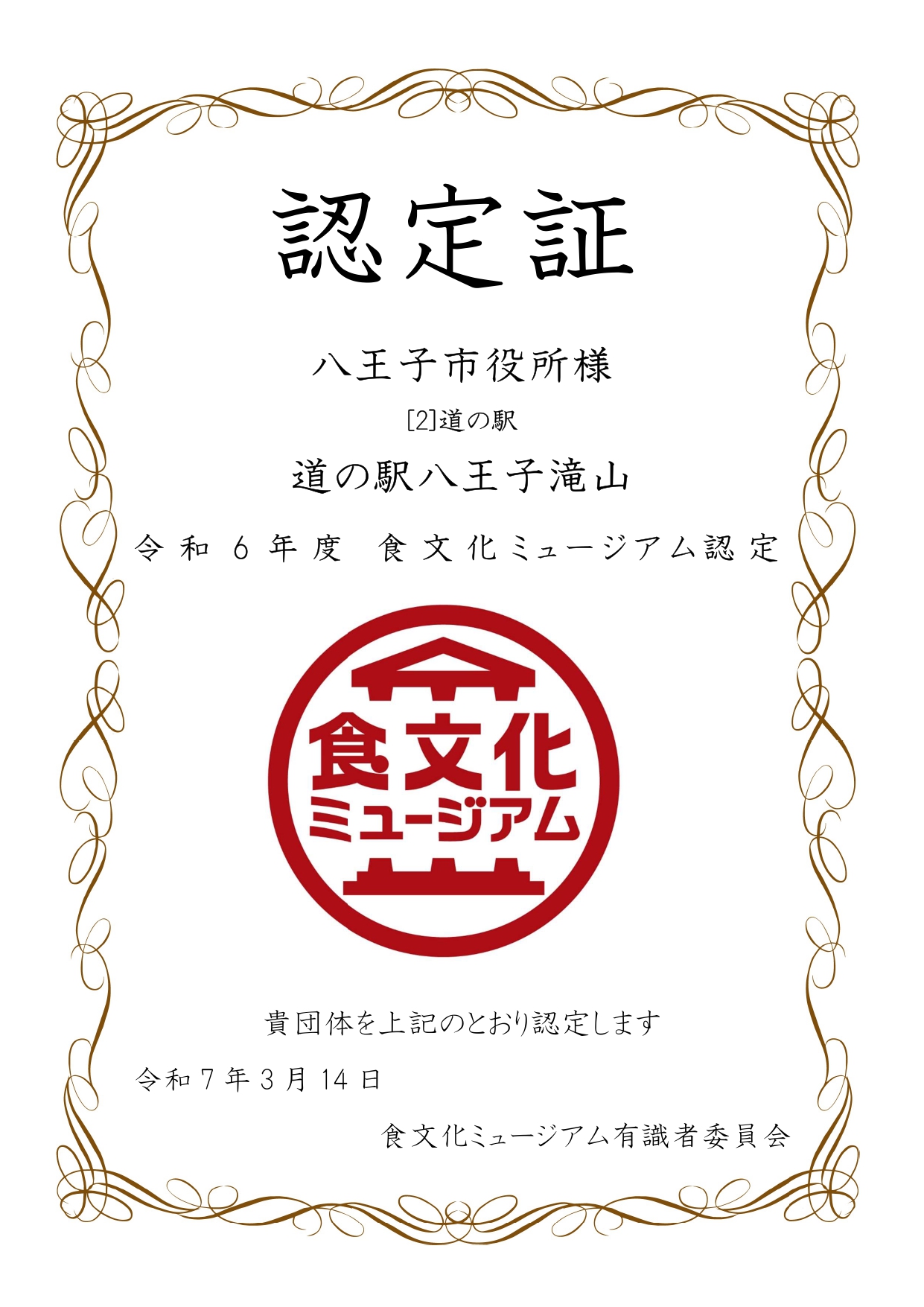 令和7年3月14日、八王子産農畜産物の販売、地場産野菜を使った郷土料理やご当地グルメ等を提供する「道の駅八王子滝山」が、文化庁により「食文化ミュージアム」に認定されました。