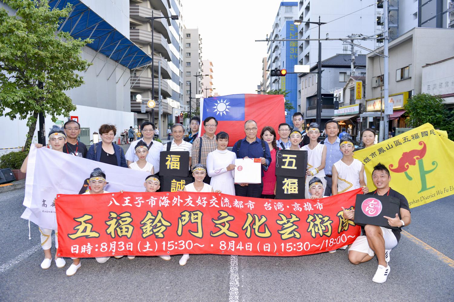台湾・高雄市から派遣された「五福鈴門文化芸術隊」が、八王子まつりにおいて中国ゴマによる迫力ある演技を披露しました。猛暑の中、情熱あふれる演技によりまつりを盛り上げるとともに、観客の皆さんからは大きな歓声が上がりました。