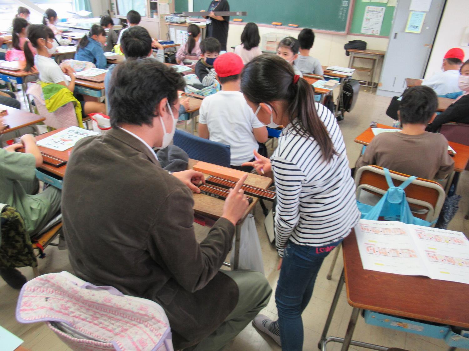 当日は、台湾にいる一柳選手と若林選手からのビデオメッセージを流したほか、PRØJECT ONE と連携している中央大学サッカー部の学生と中央大学に通う台湾の留学生たちが訪問し、給食のほか、授業にも参加しました。中央大学サッカー部には、6年生の体育の授業でサッカーを教えていただきました。留学生は、4年生の授業に参加し、子どもたちからの台湾に関する質問に答えながら、一緒にそろばんを学びました。
