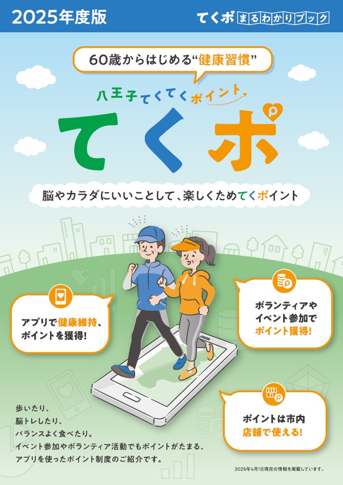 八王子市では「無理なく」「楽しく」「いつまでも」を合言葉に、令和3年10月にてくポをスタートし、市民の皆様の健康づくりを応援しています。