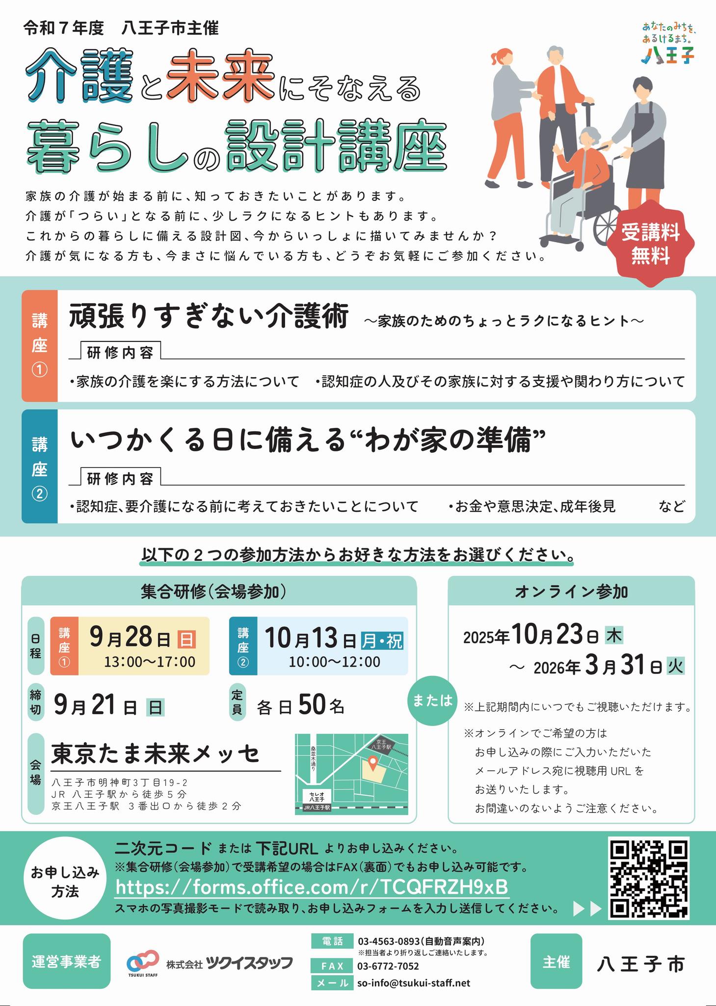| 講座(1) | 令和7年9月28日(日) | 午後1時~午後5時 | 東京たま未来メッセ(八王子市明神町3丁目19-2) ※詳細については申込後にご案内いたします。 |