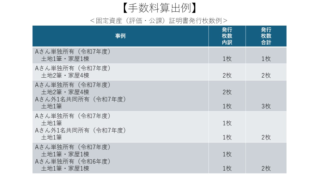 ※証明書は納税義務者ごとに発行されます。ただし、所有形態(単独所有、共同所有者別、持ち分)が異なる場合、それぞれ別の証明書として分けて発行され、手数料は別計算となります。