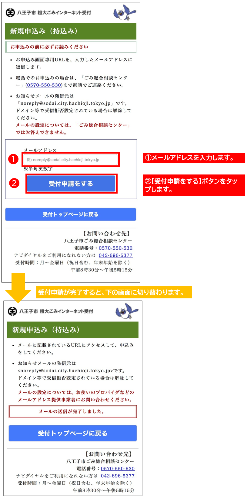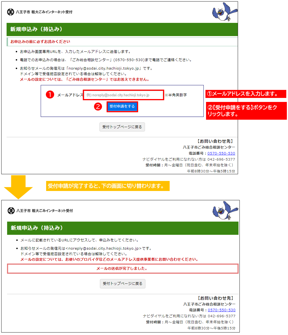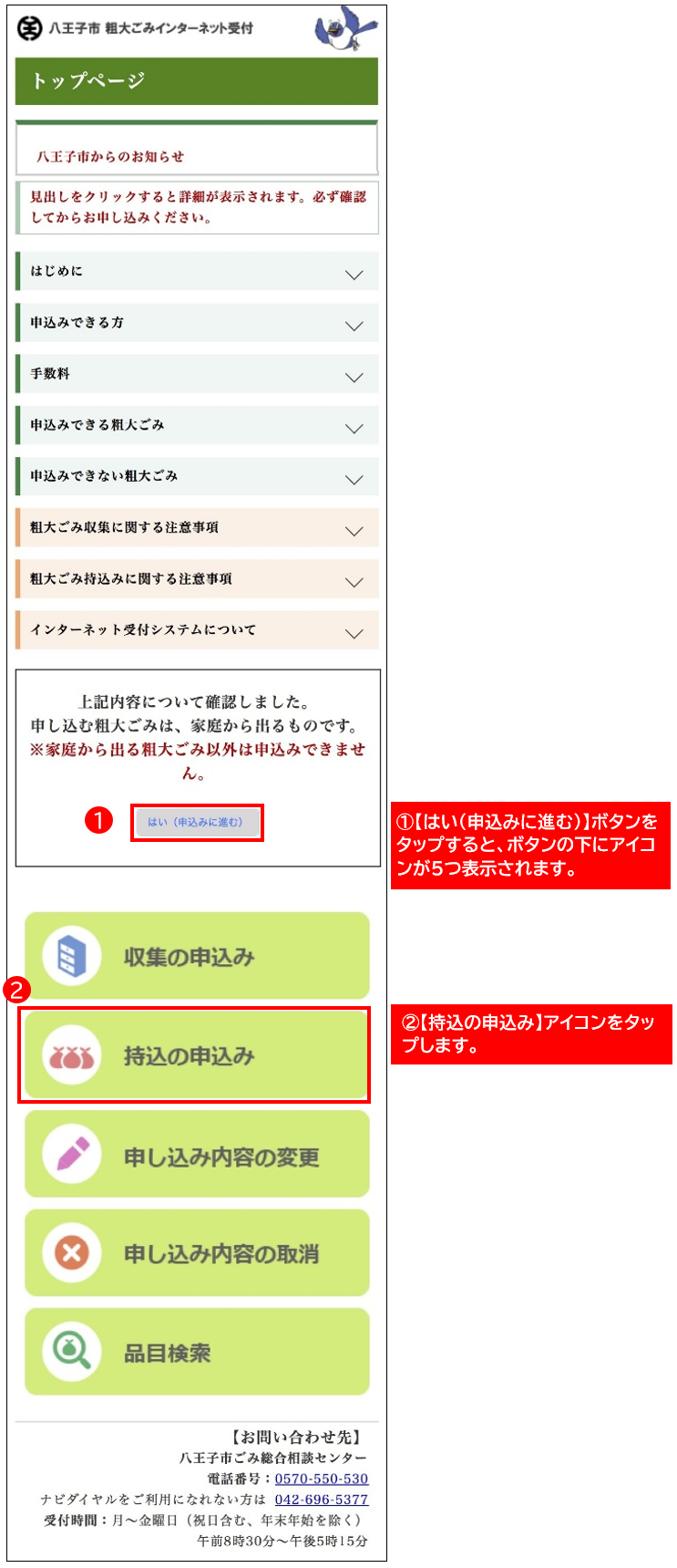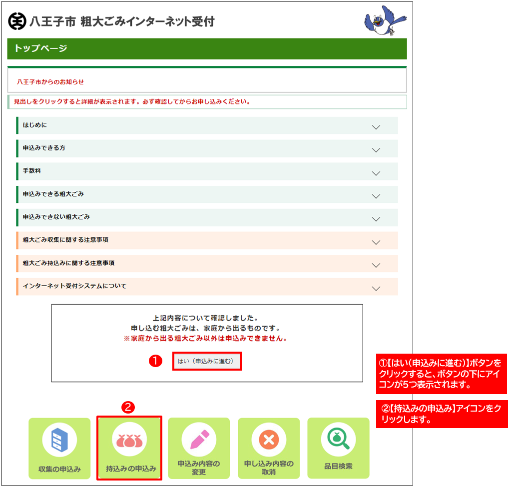 インターネット受付トップページから、持ち込みの申込を開始します。